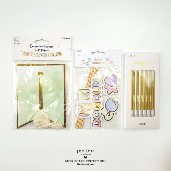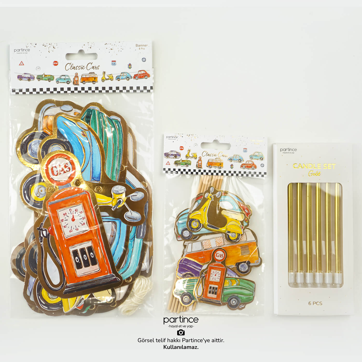 Klasik araba temalı doğum günü parti seti 3 parçadan oluşur. Partince’nin özel tasarımlarındandır. Sette bulunan ürünler: 8’li klasik araba tema banner asma süs, 8’li cake topper pasta süsü ve 6’lı gold mum. Hem doğum günü pastasında hem de cup cake üzerinde kullanılabilir. Partince’de alıntı fotoğraf kesinlikle kullanılmaz ve sadece hazırladığımız çalışmalar satışa sunulur.