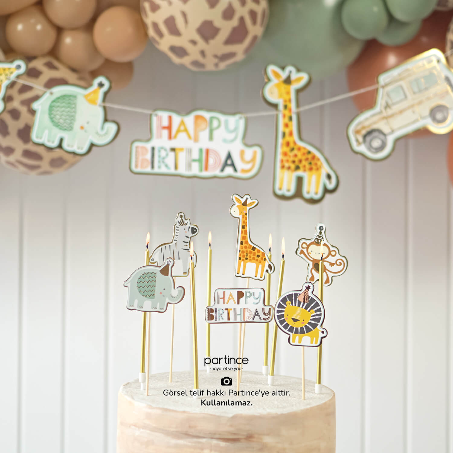 Safari konseptli doğum günü parti seti 3 parçadan oluşur. Partince’nin özel tasarımlarındandır. Sette bulunan ürünler: 7’li safari banner asma süs, 6’lı cake topper pasta süsü, 6’lı gold mum. Hem doğum günü pastasında hem de cup cake üzerinde kullanılabilir. Her ikisi de görselleştirilmiştir. Partince’de alıntı fotoğraf kesinlikle kullanılmaz ve sadece hazırladığımız çalışmalar satışa sunulur. Tüm safari temalı ürünler için tıklayınız.