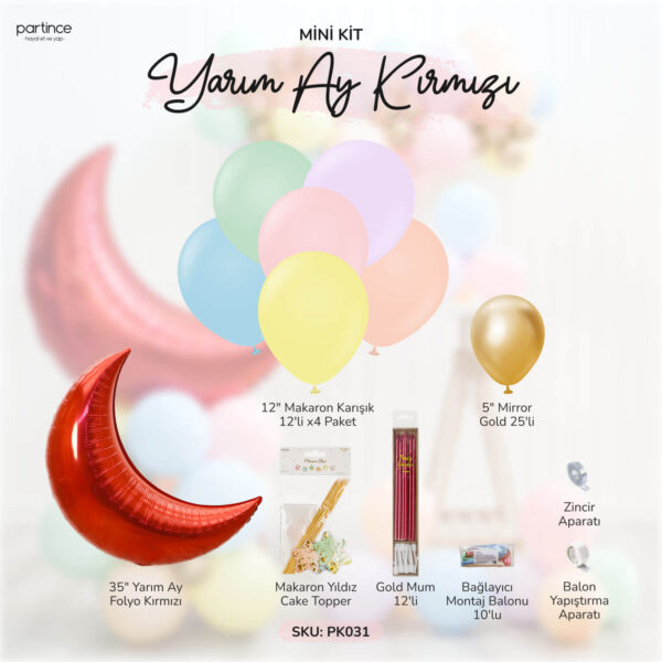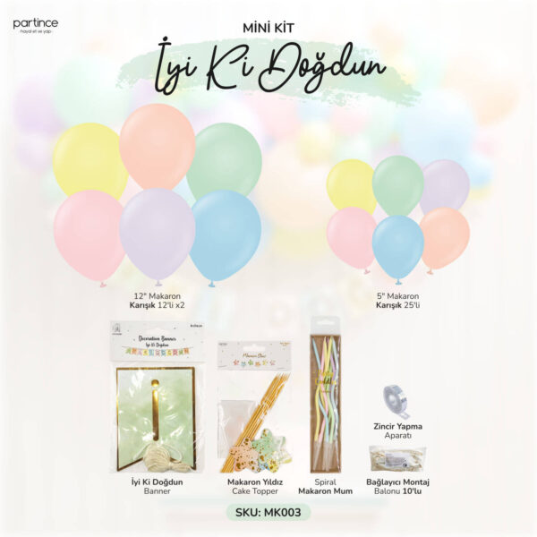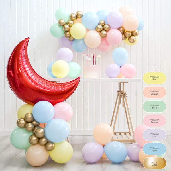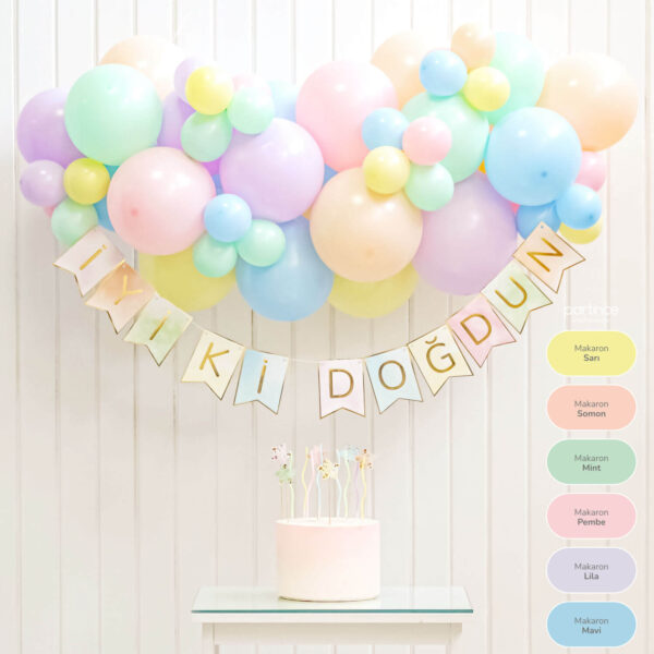 Balon zinciri nasıl yapılır? videosunu izleyerek balon zincirinin nasıl yapıldığına dair bilgi edinebilirsiniz. Makaron şeker balon zincir kitinde bulunan renkler; makaron somon, makaron mint, makaron lila, makaron pembe, makaron sarı, makaron mavi ve şeffaf. 5″, 12″, 24″ ve model balonlar bir arada kullanılmıştır. İlave olarak 9″ 5’li mini şeker folyolar, lolipop cake topper, krom uzun gold mum, 2 paket (40 gr) gold düzensiz konfeti ve balon yapıştırma bandı. Balon zincirinin yapılabilmesi için zincir aparatı ve montaj balonu da kitte bulunur. Detay grafiğinden balon zincir setinde bulunan ürünleri inceleyiniz. Kendin yap ürünüdür, balonlar sönük şekilde sevk edilir. 18″ jumbolar ilave edilerek kit zenginleştirilebilir. Partince’de alıntı fotoğraf kesinlikle kullanılmaz ve sadece hazırladığımız çalışmalar satışa sunulur. Kısa video: https://www.youtube.com/watch?v=YPxxSr3e3vw