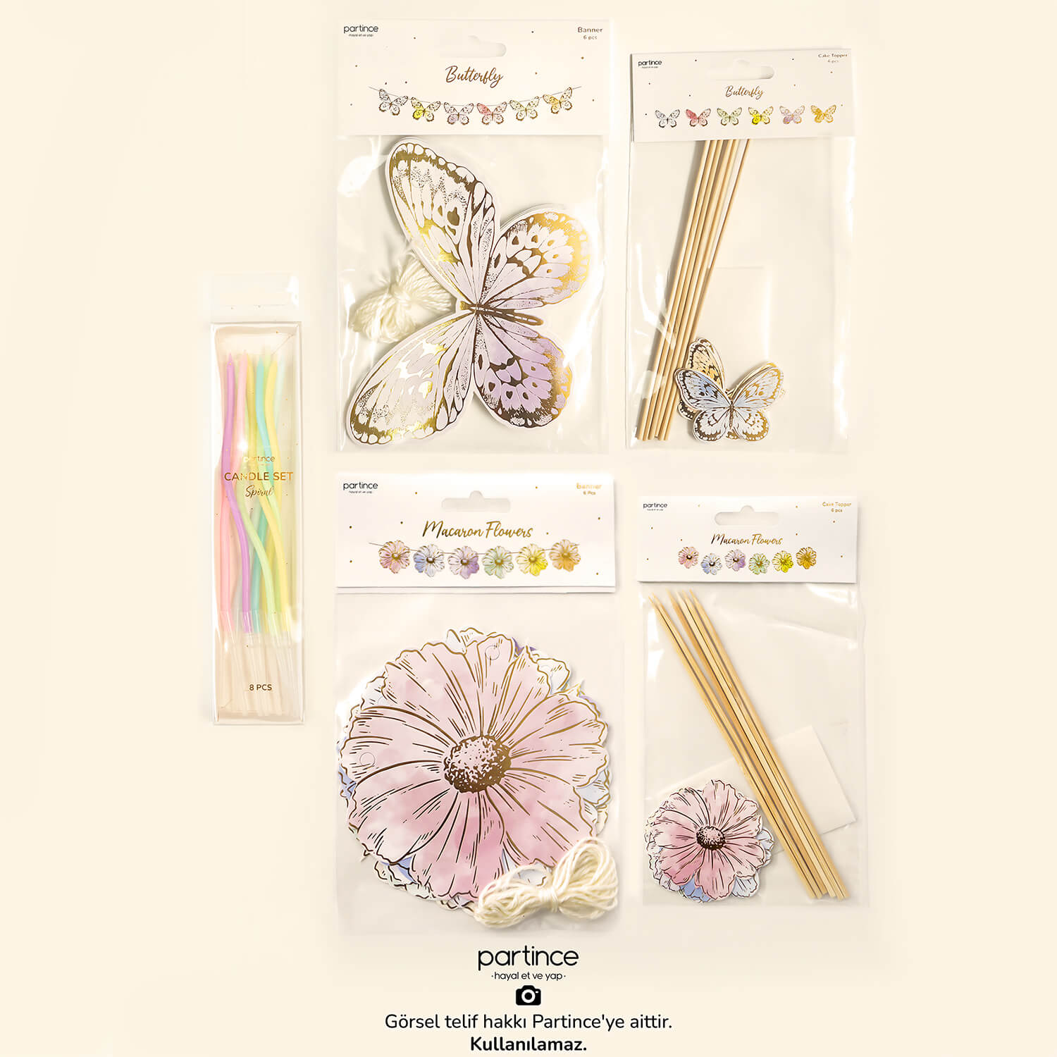 Makaron konseptli doğum günü kutlamalarında kullanabileceğiniz 5 parçadan oluşan özel tasarım parti süsleri yaldız ışıltısıyla etkinliğinize renk katacak. Kelebek çiçek konsept doğum günü parti setinde bulunan ürünler: 6’lı kelebek banner, 6’lı çiçek banner, 6’lı kelebek cake topper, 6’lı çiçek cake topper, 8’li makaron spiral mum. Sadece kelebek, sadece çiçek ya da her ikisi bir arada olacak şekilde kullanılabilir. Partince’de alıntı fotoğraf kesinlikle kullanılmaz ve sadece hazırladığımız çalışmalar satışa sunulur.