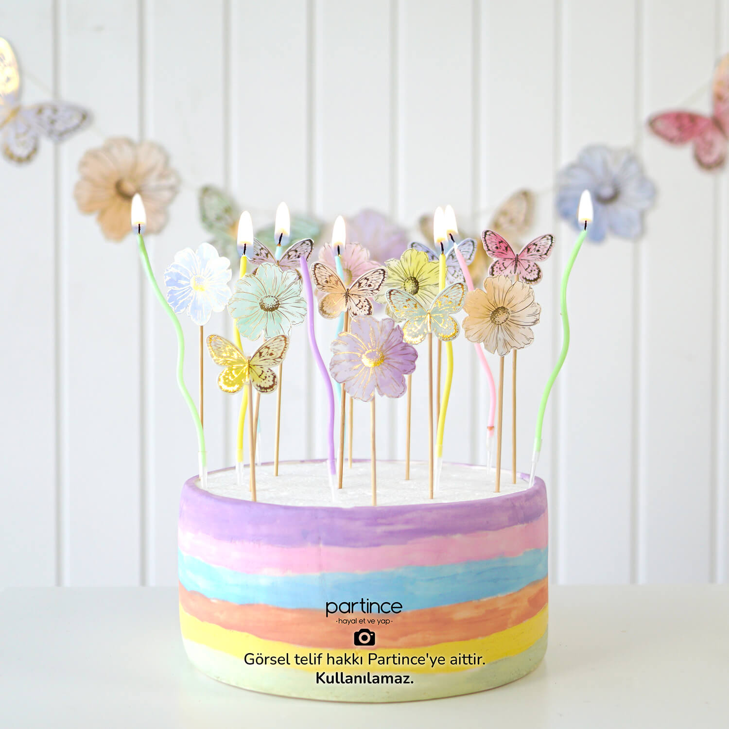 Makaron çiçekler banner partince özel tasarımlarındandır. 6 parçadan oluşur. Her bir kart 11 cm* 11 cm ölçüsündedir. Çiçek tasarımlar doğum günü organizasyonlarında süsleyici olarak ve balon zincirlerinde tamamlayıcı olarak kullanılabilir. Paket içinde 3 metre ip ile gönderilir. İpin arkada kalması için ön delikten takılmalı; arka delikten çıkarılmalıdır. Dekorasyon afişini hazırladıktan sonra ipin uçlarından bant yardımı ile duvar, masa ya da perde gibi zeminlere sabitleyebilirsiniz. Kit için bknz: MK007