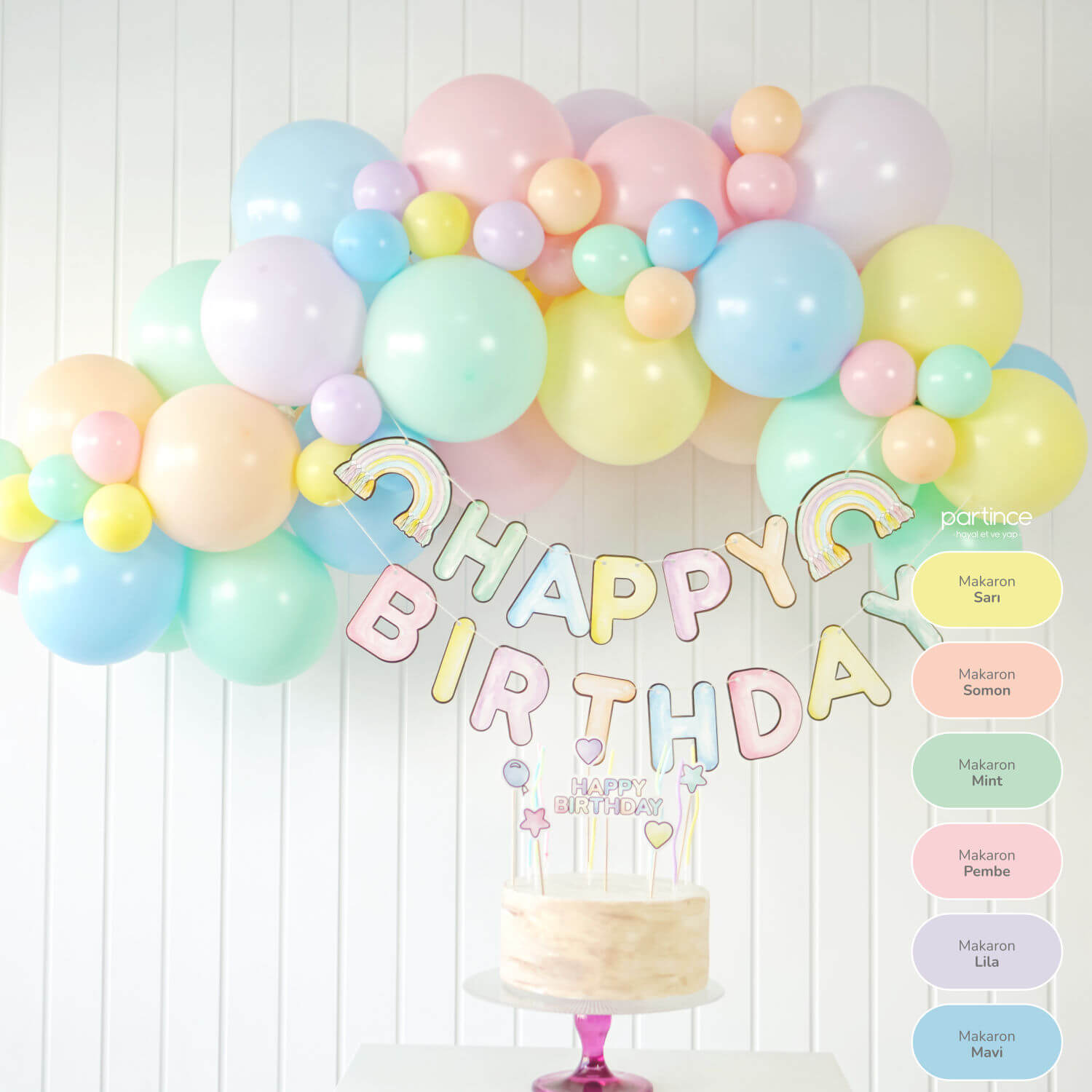 Makaron gökkuşağı balon zincir kiti. İçerikteki balonlarla 2 metrelik şık bir balon zinciri hazırlanabilir. Detay grafiğinden balon zincir setinde bulunan ürünleri inceleyiniz. Kendin yap ürünüdür, balonlar sönük şekilde sevk edilir. Nasıl yapılır videosunu izleyerek hazırlayabilirsiniz. Partince’de alıntı fotoğraf kesinlikle kullanılmaz ve sadece hazırladığımız çalışmalar satışa sunulur.