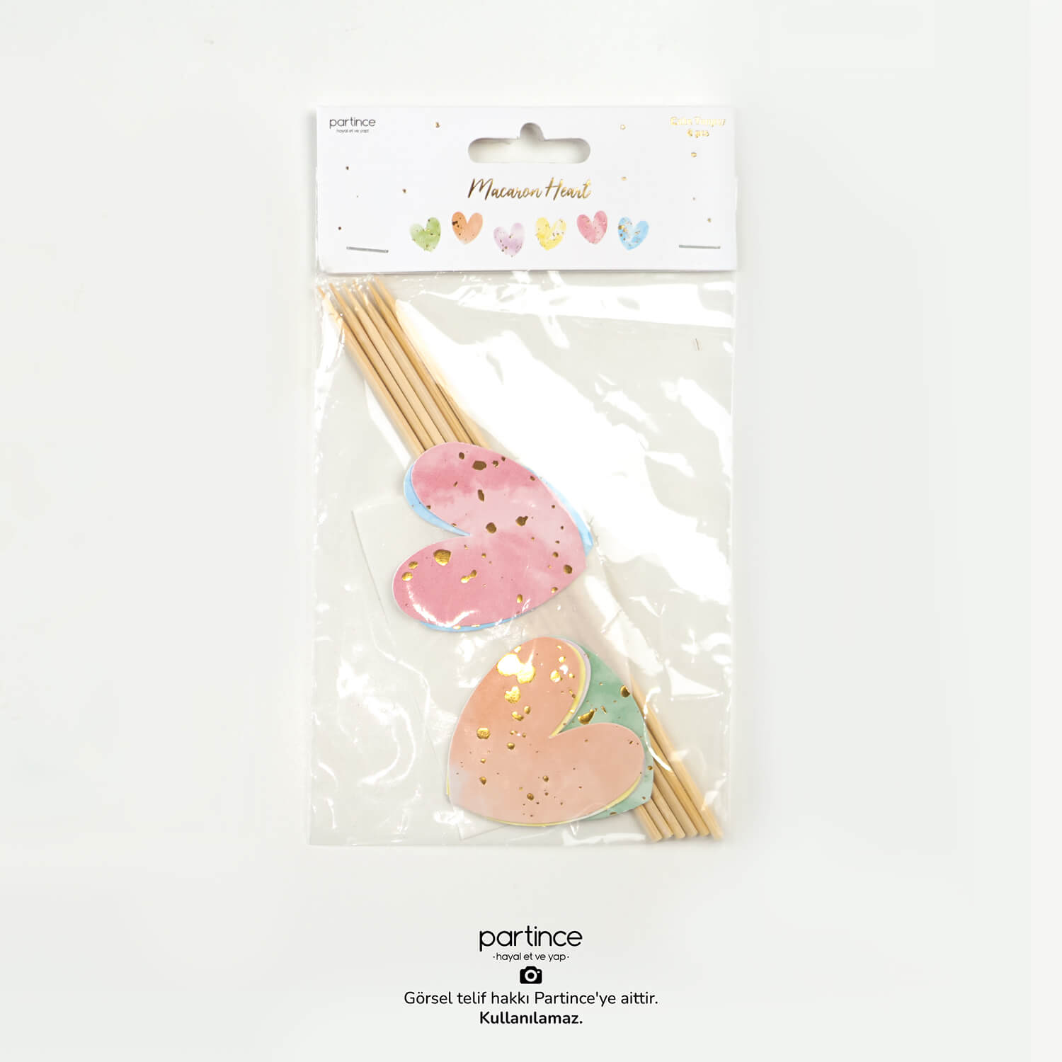 Makaron kalp cake topper gold yaldız pasta süsleyiciler partince özel tasarımlarındandır. Makaron renklerinden ve 6 parçadan oluşur. Paket içinde 6 adet cake topper, 6 adet tahta çubuk ve 6 adet yapıştırıcı bant bulunur. Ürünün arka yüzeyleri beyazdır. Ürünler bant yardımıyla çubuğa sabitlenir. Pasta üstü dekor süsler birkaç dakika içinde hazırlanabilir.