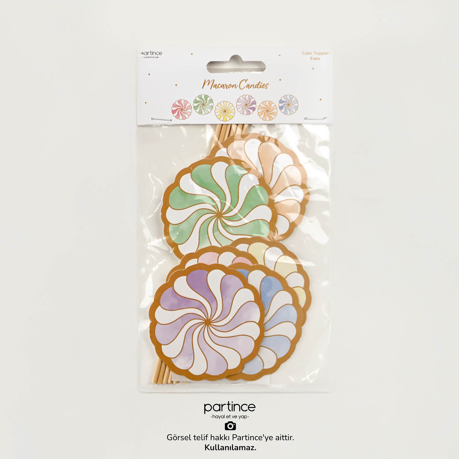 Makaron şeker cake topper pasta süsleyiciler partince özel tasarımlarındandır. 6 parçadan oluşur. Paket içinde 6 adet cake topper, 6 adet tahta çubuk ve 6 adet yapıştırıcı bant bulunur. Ürünün arka yüzeyleri beyazdır. Ürünler bant yardımıyla çubuğa sabitlenir. Pasta üstü dekor süsler birkaç dakika içinde hazırlanabilir. Kit için bknz: MK018