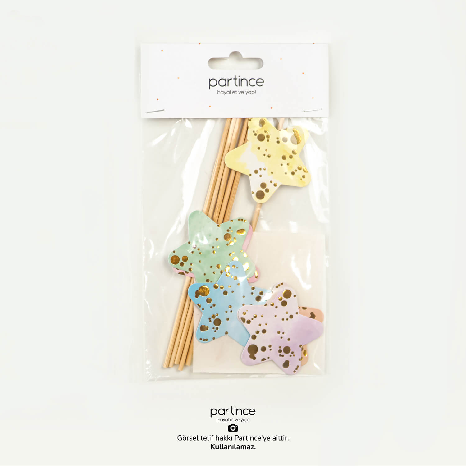 Makaron splatter cake topper pasta süsleyiciler partince özel tasarımlarındandır. 6 parçadan oluşur. Paket içinde 6 adet cake topper, 6 adet tahta çubuk ve 6 adet yapıştırıcı bant bulunur. Ürünün arka yüzeyleri beyazdır. Ürünler bant yardımıyla çubuğa sabitlenir. Pasta üstü dekor süsler birkaç dakika içinde hazırlanabilir.