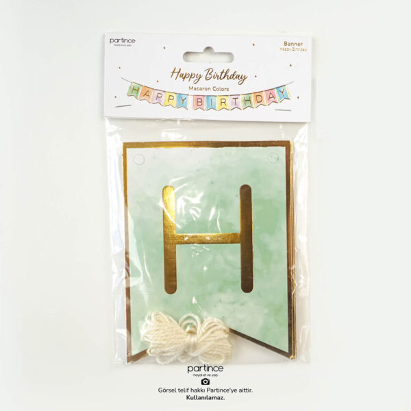 Pastel Happy Birthday yazılı doğum günü bayrak afişi 9,8 cm* 13 cm ölçüsündedir. Pastel renklere gold yaldız kullanılmıştır. Doğum günü organizasyonlarında süsleyici olarak kullanılabilir. Paket içinde 3 metre ip ile gönderilir. En son harften başlayacak şekilde ipe dizilir. İpin arkada kalması için ön delikten takılmalı; arka delikten çıkarılmalıdır. Sıralamada kolaylık sağlaması için ambalajın üzerindeki görseli referans alabilirsiniz. Doğum günü afişini hazırladıktan sonra ipin uçlarından bant yardımı ile duvar, masa ya da perde gibi zeminlere sabitleyebilirsiniz.