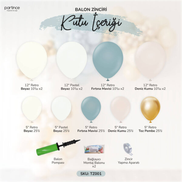 Pastel retro makaron mini ve jumbo mirror balon zinciri konsept kit 6 renkten ve 3 farklı balon boyutundan oluşur. Renkler: pastel mercan, retro deniz kumu, makaron somon, retro adaçayı, pastel gece mavisi, pastel gri ve mirror gold. Lateks balonlar 5, 12 ve 18 boyutundadır. Zincirin eşit renk dağılımıyla hazırlanabilmesi için, her balon rengi ayrı ambalajda gönderilir. 12″ boyuttan 25 x 6 paket, 5″ boyuttan 25 x 3 paket, 18″ boyuttan 4 adet bulunur. Fotoğrafta paketteki tüm balonlar kullanılmıştır. İsteğe göre renkler ikiye bölünebilir ve iki farklı zincir oluşturulabilir.