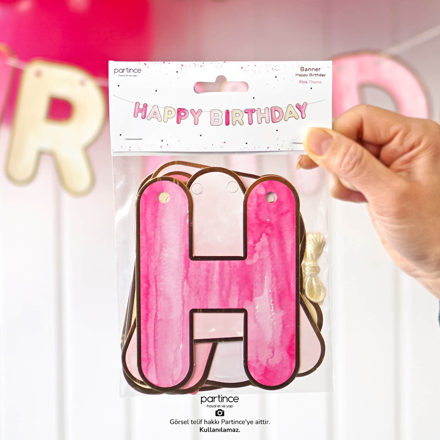 Pembe Tema Happy Birthday Yazılı Banner Asma Süs