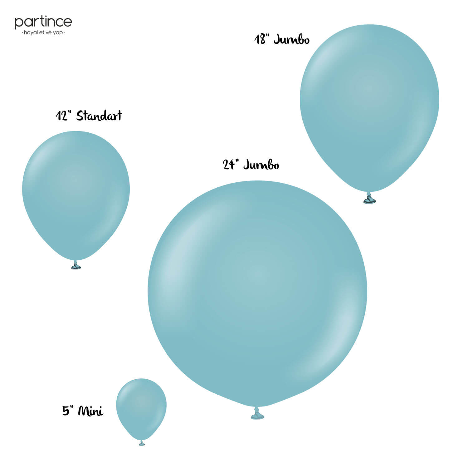 Mavi cam renk retro balonlar 4 farklı boyutta üretilir. 5″ – 12,50 cm, 12″ – 30 cm, 18″ – 45 cm ve 24″ – 60 cm olarak satışa sunulur. İç ve dış mekan balon süslemelerinde, zincir balon yapımında kullanılır. %100 doğal lateksten üretilmiştir, doğaya karışabilir. Seçim yaptıktan sonra resim alanından alternatif görselleri inceleyebilirsiniz. Balon boyutlarını ve paket içi adetleri tablodan inceleyiniz.